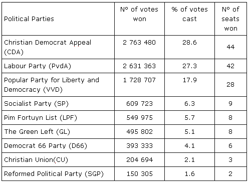 - The Christian Democrat Appeal (CDA), a centre-right party created in the 70's after the merger of three parties, the Popular Catholic Party (KVP), the Anti-Revolutionary Party (ARP) and the Historical Christian Union (CHU) in reaction to the secularisation of society. The CDA, led by Prime Minister Jan Peter Balkenende has 44 MPs;