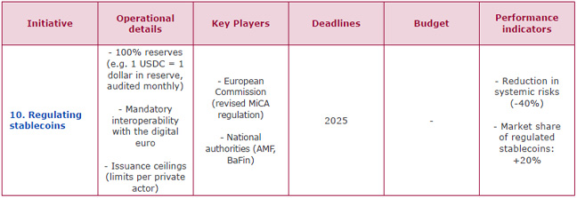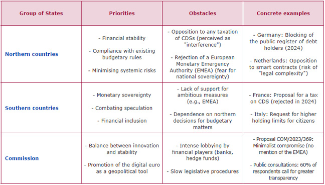 The table below illustrates these differences: the northern countries, committed to fiscal orthodoxy, are blocking the most innovative measures (e.g. EMEA, tax on CDS (credit default swaps)), while southern countries, faced with more pressing social and economic challenges (unemployment, public debt), are pushing for more ambitious tools. Caught between these two fires, the Commission is proposing minimalist compromises, which risk rendering the digital euro ineffective in the face of geopolitical challenges.