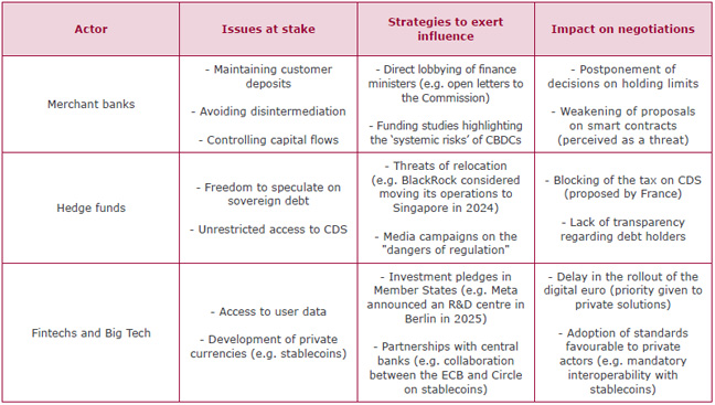 The influence of financial players on European negotiations is a key factor in the stalling of the project. Three main interest groups exert constant pressure on decision-makers. The table below shows how private interests shape public policy. Merchant banks, for example, fear a flight of deposits to the digital euro (estimated at 15-20% by the ECB), which would reduce their ability to grant loans. Hedge funds speculate heavily on European sovereign debt via CDSs, with estimated gains of 15-20% on French ATBs in 2024[1]. Their opposition to any regulation (e.g. a 0.1% tax on CDS) has led to a status quo that costs European taxpayers €80 billion a year.