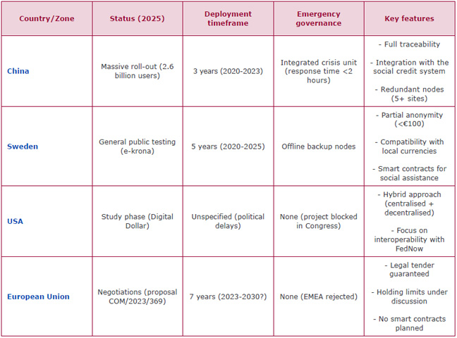 While China has rolled out its digital yuan in three years (2020-2023), Europe is falling behind. The table below compares the timelines and progress of the main players. It highlights the growing gap between the European Union and its competitors. China has not only rolled out its CBDC in record time, but has also incorporated resilience mechanisms (redundant nodes, crisis unit) that are absent from the European project. Sweden, although smaller, has innovated with solutions tailored to its citizens (partial anonymity, smart contracts). The European Union remains bogged down in political debates, with no emergency governance or advanced features. The result: an increased risk of marginalisation in the face of the digital yuan and private stablecoins.