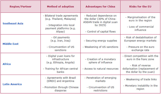 Since 2020, China has been using its digital yuan as a tool for its soft power, specifically targeting developing countries and economies under sanctions. To illustrate this strategy, the table below reveals China's systematic approach to expanding its monetary influence by targeting regions where the European Union and the United States are vulnerable. In Africa, for example, the digital yuan is presented as an ‘unconditional’ alternative to IMF loans, appealing to countries such as Ethiopia and Angola. For the European Union, the risk is twofold: loss of market share (Africa accounts for 10% of European exports) and weakening of the euro as a reserve currency. Without a coordinated European response, the digital yuan could become the dominant currency in South-South trade by 2030.