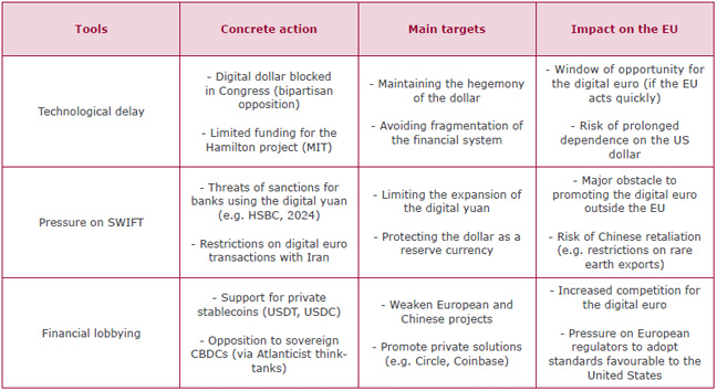 The United States is adopting a dual strategy: on the one hand, it is slowing down the development of its digital dollar to avoid undermining the current system; on the other hand, it is using its power over financial infrastructures (SWIFT, Fedwire) to limit the expansion of competing CBDCs. The United States is playing a double game: it is delaying its own CBDC to avoid weakening the dollar, while sabotaging competing projects (digital yuan, digital euro) via pressure on SWIFT and support for private stablecoins. This creates a dilemma for the European Union: either it accelerates the rollout of the digital euro to take advantage of the window of opportunity created by American inaction, or it submits to the rules of the game imposed by Washington and Beijing.