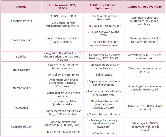 Stablecoins (USDT, USDC) and private cryptocurrencies (Bitcoin, Ethereum) are capturing a growing share of the payments market, particularly in emerging economies. The table below shows that stablecoins have a considerable lead in terms of adoption and ease of use, but suffer from systemic risks (opacity, volatility). CBDCs, on the other hand, offer institutional stability, but their deployment is slow and complex. For the digital euro, the challenge is twofold: to catch up in terms of adoption (via innovative features such as smart contracts), and to regulate stablecoins to prevent them from permanently capturing the market (e.g. 100% reserve requirement, forced interoperability with the digital euro). The table compares their adoption with sovereign CBDCs.
