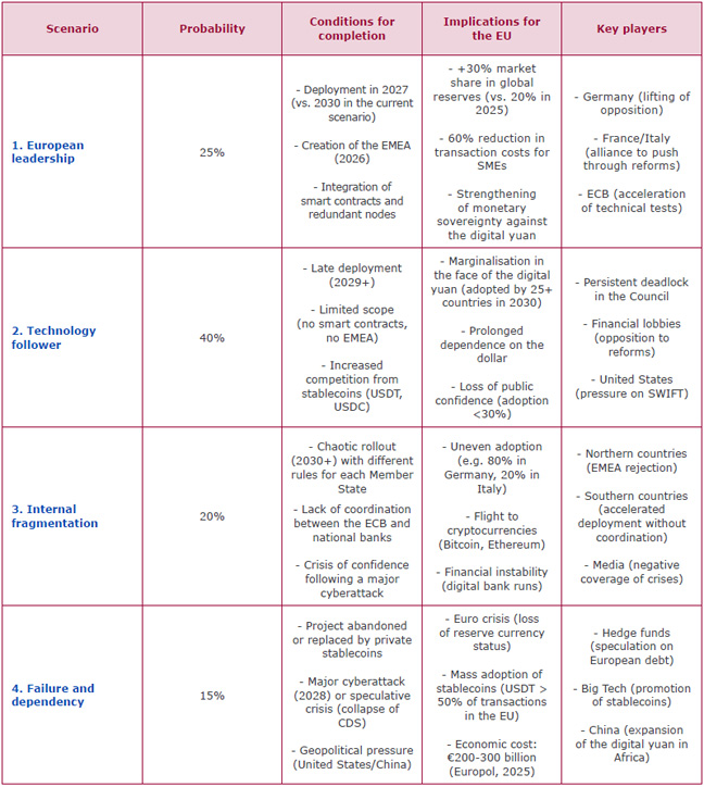 Scenario 2 (Technology Follower) is the most likely (40%) according to current projections, as it reflects the European Union's current inertia (political deadlock, financial lobbying). It would be the case if the European Union maintained its slow and conservative pace of deployment, without daring to undertake the necessary structural reforms: no smart contracts, no Authority (EMEA), and strict holding limits imposed by northern countries. Financial lobbies (commercial banks, hedge funds) and American pressure (via SWIFT and stablecoins) would then have succeeded in neutralising the most ambitious measures. The digital yuan, already adopted by more than 25 countries (particularly in Africa and South-East Asia), would then dominate South-South trade, while the dollar would remain the undisputed reserve currency.