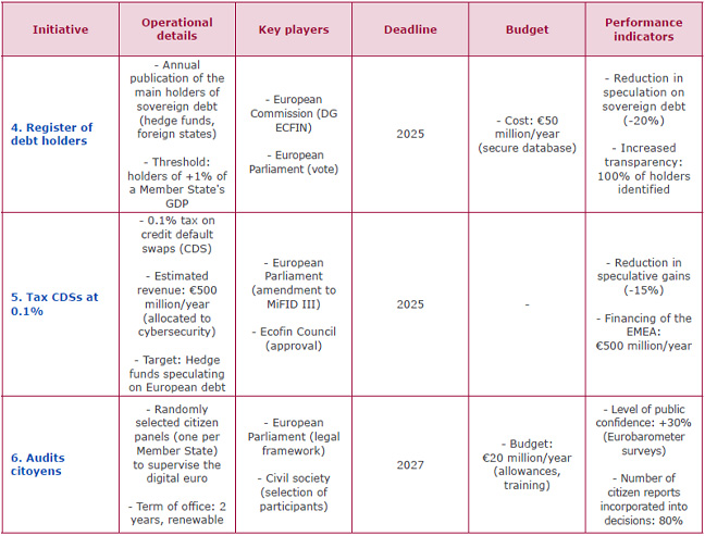These measures aim to restore confidence in the digital euro, which has been eroded by financial scandals (e.g. speculation on sovereign debt) and a lack of transparency. The debt holder register would limit speculation (cost: €80 billion/year for the EU), while the CDS tax would generate revenue to finance resilience. Citizen audits, inspired by the Icelandic model, are a democratic innovation to involve citizens in monetary governance.