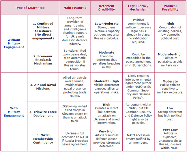 The spectrum of possible guarantees illustrates the balance that must be struck between feasibility and resolve. Or as always in politics, between what is desirable and what is possible. The ‘softer’ forms of support, such as sanctions or continued military assistance without direct engagement, can reinforce Ukraine’s capacity to defend itself but cannot alone ensure compliance by Russia. More robust options, including direct military involvement or NATO membership, carry greater deterrent value but also higher political and legal risks.