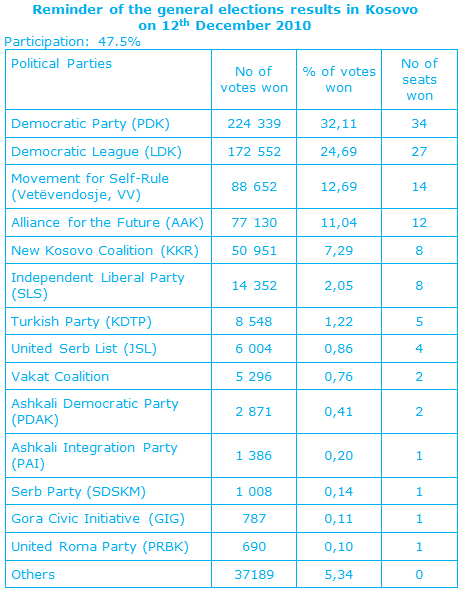 The Kosovars voted six months ago to renew their local representatives. The country has 38 towns 10 of which have a Serb majority (6 enclaves and 4 towns: Leposavic/Leposaviq, Zubin Potok, Zvecan/Zvecan and North Mitrovica). The local election was the first in which the Serb minority took part since Kosovo's independence on 7th February 2008 (the first general elections were organised under international guidance and monitoring in 2010).