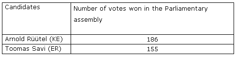 On 21st September 2001, the present President of the Republic, Arnold Rüütel, was elected by the parliamentary assembly winning 186 votes during the second round of the election. Five years previously on 20th September 1996 Lennart Meri was also appointed by the parliamentary assembly during a second round of voting (196 votes).