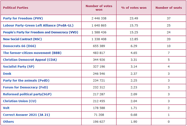 - The Party for Freedom (PVV), a right-wing populist party founded in 2002 by Geert Wilders, has 37 seats;