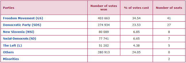 - The Freedom Movement (GS), a pro-European liberal party founded in 2022, succeeded the Green Action Party (Z-DEJ). It is led by Robert Golob and won 41 seats.