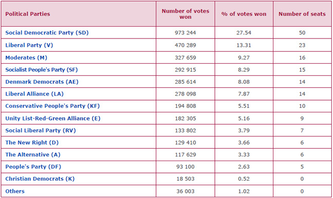 - The Social Democratic Party (SD), founded in 1871 and led since April 2015 by outgoing Prime Minister Mette Frederiksen, has 50 seats