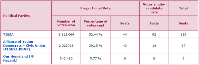 On 12 April, Peter Magyar (Tisza – EPP, centre-right) succeeded in his bid to oust Viktor Orbán (Fidesz – PfE, far right) after sixteen years in power, thereby denying him a fifth term. His party, Tisza, won a resounding victory in Hungary’s general election with 52.44% of the vote and 136 seats in the Országgyűlés, the Hungarian parliament, out of a total of 199. Fidesz secured 39.15% and 57 seats, whilst Our Homeland (Mi Hazánk) won 5.77% and 6 seats. The Democratic Coalition, along with the Two-Tailed Dog Party, failed to secure enough votes to be represented in parliament, having fallen short of the required 5% threshold. Consequently, only three parties will sit in the next assembly.