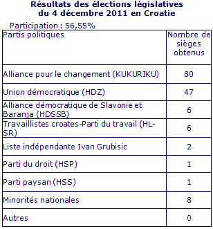 La coalition Kukuriku - "l'Alliance pour le changement" - emmenée par le Parti social-démocrate (SDP), principal parti d'opposition dirigé par Zoran Milanovic, et regroupant le Parti démocrate d'Istrie (IDS) dirigé par Ivan Jakovcic, le Parti populaire-Libéraux démocrates (HNS) de Radimir Cacic et le Parti des retraités (HSU) dirigé par Silvano Hrelja, est arrivée en tête des élections législatives qui se déroulaient le 4 décembre en Croatie avec 44,5% des suffrages et 80 sièges (+13 par rapport au précédent scrutin du 25 novembre 2007) au Hrvatski Sabor, chambre unique du Parlement. Elle devance l'Union démocratique (HDZ) de la Premier ministre sortante Jadranka Kosor qui a obtenu 22,1% des voix et 47 sièges (-19). L'Alliance démocratique de Slavonie et Baranja (HDSSB) de Vladimir Sisljagic remporte 6 sièges tout comme les Travaillistes croates-Parti du travail (HL-SR) dirigé par Dragutin Lesar. La Liste indépendante emmenée par l'ancien prêtre, Ivan Grubisic, remporte 2 députés. Le Parti paysan (HSS), dirigé par Josip Frisic et membre de la coalition gouvernementale sortante, obtient 1 siège, tout comme le Parti du droit (HSP).