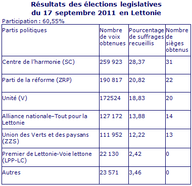 Le 17 septembre, un parti de gauche est arrivé en tête des élections législatives lettones pour la première fois depuis 1991, année où le pays a recouvré son indépendance. Le Centre de l'harmonie (SC) a recueilli 28,37% des suffrages et remporté 31 sièges au parlement (+ 2 par rapport au précédent scrutin législatif du 2 octobre 2010). Il a obtenu 52,08% des voix dans la circonscription de Latgale et 41,56% dans celle de Riga. Le Centre de l'harmonie s'impose devant le Parti de la réforme de Zatlers (PRZ), parti de droite fondée par l'ancien président de la République (2007-2011) Valdis Zatlers, qui a recueilli 20,82% des suffrages et 22 sièges et Unité (V), parti du Premier ministre sortant Valdis Dombrovskis, qui a obtenu 18,83% des voix et 20 sièges (- 13). Le centre-droit sort donc également renforcé de ces élections législatives et devrait pouvoir former un gouvernement.