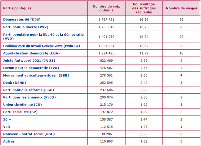 Les partis de droite radicale (PVV, Forum pour la démocratie (FvD), conduit par Thierry Baudet et Juiste Antwoord 2021 (Réponse juste, JA21)) ont obtenu ensemble 26,57% des voix et 42 sièges, soit près d’un tiers de la chambre basse du Parlement. Juiste Antwoord 2021 a fait un bond en avant avec 5,95% des suffrages (+8). « Le résultat est plus fragmenté mais l'extrême droite reste un bloc important » a indiqué Benjamin Biard, chercheur au Centre de recherche et d'information socio-politiques (CRISP) de Bruxelles. En outre, la rhétorique anti-immigrés de Geert Wilders s’est diffusée dans le paysage politique et a été reprise par de nombreux partis. « La droite traditionnelle a adopté une vision des problèmes sociaux caractéristique de l’extrême droite. Elle met l’accent sur les différences culturelles entre les « Néerlandais » et les citoyens issus de l’immigration, qui sont désormais présentées comme la cause profonde de plusieurs de ces problèmes. C’est par exemple le cas pour la crise du logement attribuée aux demandeurs d’asile, aux expatriés et aux étudiants internationaux » a déclaré Sarah de Lange, professeur de science politique de l’université d’Amsterdam.