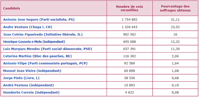 10,9 millions de Portugais, dont 1,6 million résidant à l'étranger, ont choisi : Antonio Jose Seguro (Parti socialiste, PS), ancien secrétaire général du Parti socialiste (2011-2014), et Andre Ventura (Chega ! Assez !, CH), fondateur et dirigeant du parti de droite radicale, sont les deux candidats arrivés en tête du 1er tour de l’élection présidentielle le 18 janvier. Une fois de plus, les enquêtes d’opinion ont échoué à anticiper les résultats du scrutin.