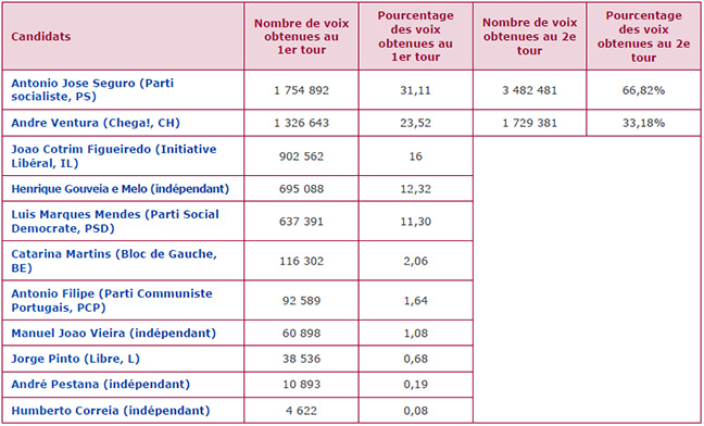 Malgré de violentes tempêtes qui ont frappé le Portugal ces derniers jours et certains appels au report du scrutin, le second tour de l'élection présidentielle s’est tenu le 8 février. Les Portugais ont élu António José Seguro, qui succèdera à Marcelo Rebelo de Sousa. Ce dernier a accompli deux mandats de cinq ans et ne peut pas se représenter. Avec 66.82% des voix, il a largement devancé André Ventura qui a obtenu 33,18%. La participation s’est élevée à 50,11%.
