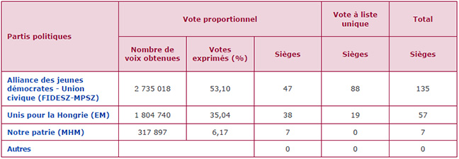 L'Orszaggyules (Assemblée nationale), chambre unique du Parlement, comprend 199 députés élus pour un mandat de quatre ans : 106 d'entre eux sont élus dans des circonscriptions uninominales et 93 à la proportionnelle. Les électeurs ont deux bulletins de vote : l'un pour choisir un parti politique, l'autre pour voter pour un candidat.