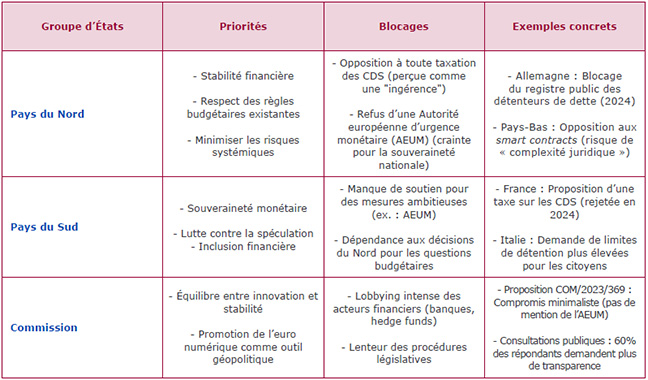 Le tableau ci-dessous illustre ces divergences : les pays du Nord, attachés à une orthodoxie budgétaire, bloquent les mesures les plus innovantes (ex. : AEUM, taxe sur les CDS), tandis que les pays du Sud, confrontés à des défis sociaux et économiques plus pressants (chômage, dette publique), poussent pour des outils plus ambitieux. La Commission, prise entre ces deux feux, propose des compromis minimalistes, qui risquent de rendre l’euro numérique inefficace face aux défis géopolitiques.