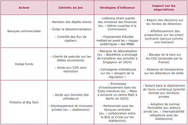 L’influence des acteurs financiers sur les négociations européennes est un facteur clé du ralentissement du projet. Trois groupes d’intérêts principaux exercent une pression constante sur les décideurs. Le tableau ci-dessous montre comment les intérêts privés façonnent les politiques publiques. Les banques commerciales, par exemple, craignent une fuite des dépôts vers l’euro numérique (estimée à 15-20% par la BCE), ce qui réduirait leur capacité à octroyer des crédits. Les hedge funds spéculent massivement sur les dettes souveraines européennes via des CDS, avec des gains estimés à 15-20% sur les OAT françaises en 2024[1]. Leur opposition à toute régulation (ex. : taxe de 0,1% sur les CDS) a conduit à un statut quo qui coûte 80 milliards d’euros par an aux contribuables européens.