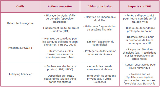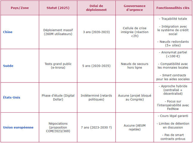 Source : Rapports du Congrès américain sur les MNBC (2024), Études de la Fed sur le digital dollar (2023), Articles du Wall Street Journal (2025).