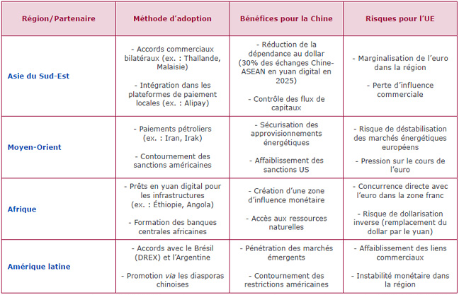 Depuis 2020, la Chine utilise son yuan digital comme outil de soft power, ciblant spécifiquement les pays en développement et les économies sous sanctions. Pour détailler cette stratégie, le tableau ci-dessous révèle une stratégie systématique de la Chine pour étendre son influence monétaire, en ciblant les régions où l’Union européenne et les États-Unis sont vulnérables. En Afrique, par exemple, le yuan digital est présenté comme une alternative « sans conditions » aux prêts du FMI, séduisant des pays comme l’Éthiopie ou l’Angola. Pour l’Union européenne, le risque est double : perte de parts de marché (l’Afrique représente 10% des exportations européennes) et affaiblissement de l’euro comme monnaie de réserve. Sans une réponse européenne coordonnée, le yuan digital pourrait devenir la monnaie dominante dans les échanges Sud-Sud d’ici 2030.