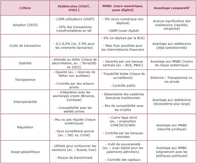 Comparaison entre stablecoins privés et MNBC souveraines (2025)