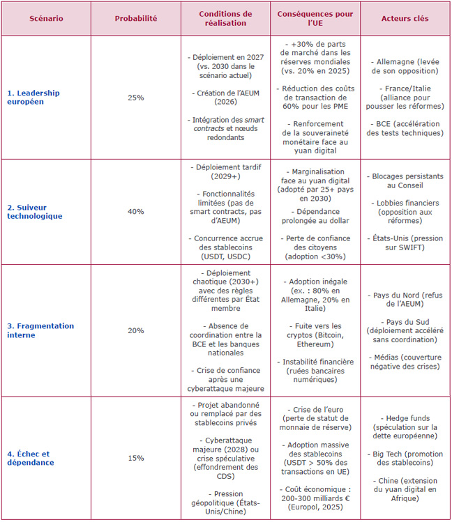 Les variables sont, entre autres, la vitesse de déploiement (2027 vs. 2030), le niveau de coopération internationale (Union européenne-Chine-États-Unis), la régulation des acteurs privés (stablecoins, cryptos).
