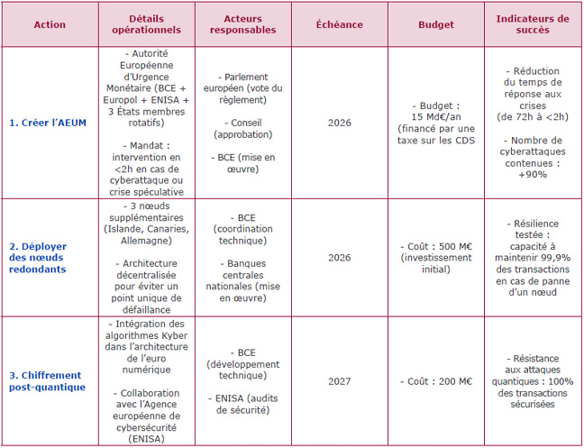 Ce plan d’action vise à renforcer la résilience de l’euro numérique face aux cybermenaces (coût estimé à 10 milliards €/an par Europol) et aux crises spéculatives. L’AEUM est la pièce maîtresse : sans elle, une cyberattaque pourrait paralyser les paiements pendant 48h, avec un coût de 0,5% du PIB européen par jour (BCE, 2023). Les nœuds redondants et le chiffrement post-quantique sont des garanties techniques pour éviter un scénario catastrophe.