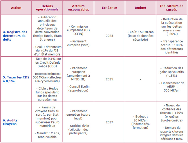 Ces mesures visent à restaurer la confiance dans l’euro numérique, érodée par les scandales financiers (ex. : spéculation sur les dettes souveraines) et le manque de transparence. Le registre des détenteurs de dette permettrait de limiter la spéculation (coût : 80 milliards €/an pour l’Union), tandis que la taxe sur les CDS générerait des recettes pour financer la résilience. Les audits citoyens, inspirés du modèle islandais, sont une innovation démocratique pour impliquer les citoyens dans la gouvernance monétaire.