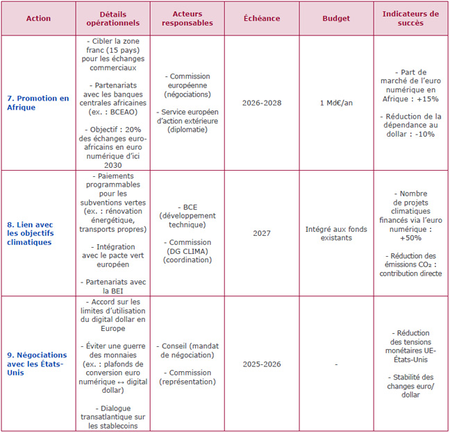 Cette stratégie géopolitique vise à positionner l’euro numérique comme un outil de puissance, en ciblant trois leviers possibles : l’Afrique, un marché clé où le yuan digital progresse rapidement (ex. : Éthiopie, Angola) ; la transition écologique, possible argument fort pour différencier l’euro numérique des autres MNBC ; le dialogue avec les États-Unis, pour éviter une guerre des monnaies qui affaiblirait les deux camps.
