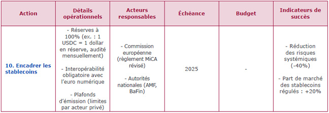 Ce cadre réglementaire est crucial pour éviter que les stablecoins privés (USDT, USDC) ne marginalisent l’euro numérique. Les réserves à 100% et l’interopérabilité obligatoire sont des mesures inspirées des recommandations du FMI (2024) pour limiter les risques systémiques. Sans cette régulation, les stablecoins pourraient capter jusqu’à 50% des transactions transfrontalières dans l’Union européenne d’ici 2030 (étude de la BCE, 2025).