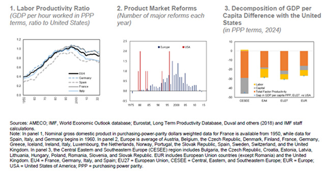 L’économie européenne souffre, par rapport à ses concurrents internationaux, d’un déficit croissant de sa productivité. Ainsi, alors que le PNB par habitant était à parité avec celui des États-Unis dans les années 1990, il est désormais 20% plus faible qu’aux Etats-Unis et la principale raison en est le déficit de productivité du travail[1].