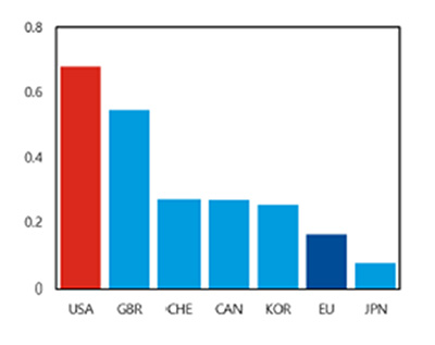 Le marché américain des fonds propres (public and private equity) est 2,5 fois plus important aux États-Unis qu’en Europe. Les actifs financiers y représentent 80 trillions $, et sont aux 2/3 constitués de fonds propres, alors qu’en Europe et en Chine, ils sont chacun de 60 trillions $, avec un 1/3 constitué de fonds propres[11].
