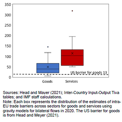 La seconde cause tient à la fragmentation du marché européen. L’intensité du commerce entre les vingt-sept Etats membres représente 40% de celle existant entre les cinquante États américains ; les barrières commerciales (restrictions induites par les administrations sur le commerce international) sont estimées à environ 45% pour les biens et 110% pour les services. Cela représente un progrès de respectivement 6 et 11% depuis 1995, alors que les barrières sur les biens sont de 15% aux Etats-Unis[6].