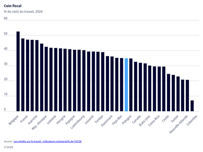 L’économie européenne subit également un coût du travail supérieur. Le surcoût fiscal et social est supérieur d’environ 50%. Les impôts et cotisations sociales (tax wedge) sur un salaire moyen sont de 30% aux Etats-Unis, 29% au Royaume-Uni, 33% au Japon et 45% en Europe (48% en Allemagne, 47% en France) en 2024[7].