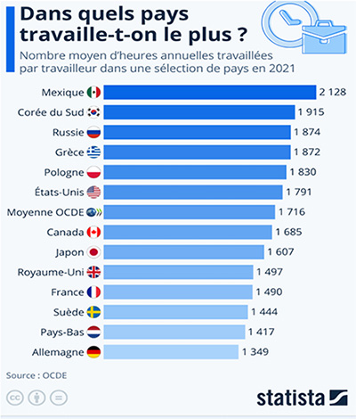 Le temps travaillé est sensiblement inférieur : pour 1800 heures travaillées par an aux Etats-Unis, l’Allemagne travaille 1350 heures et la France 1500[8]. L’écart est encore plus fort lorsque l’on regarde le temps total travaillé au cours d’une vie : l’âge de la retraite effectif moyen est de 68 ans au Japon, 65 aux Etats-Unis, 63 en Allemagne, 61 en France. Enfin, le taux de chômage est aux Etats-Unis de 4,2%, au Royaume-Uni de 4,5%, en Allemagne de 3,5%, en France de 7,6%, en Italie de 6,7% et au Japon de 2,5%[9].