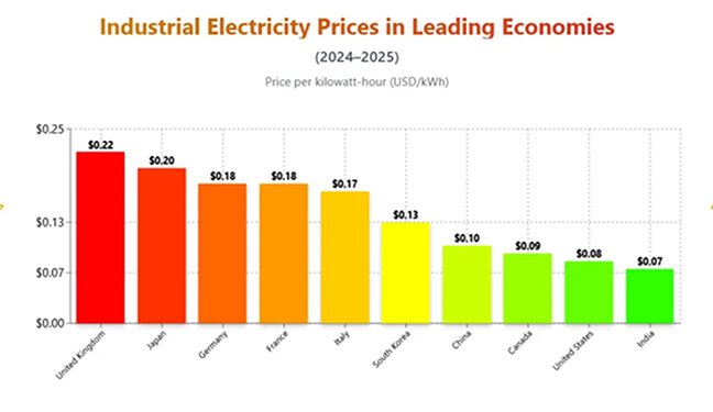 Le coût de l’énergie, du fait principalement de la disparition des énergies fossiles d’origine russe et de la faible utilisation de l’énergie nucléaire dans l’Union européenne, est deux à trois fois plus élevée qu’aux Etats-Unis. L’électricité renouvelable reste chère, l’éolien étant moins performant qu’attendu et le solaire atteignant un plateau. En effet, son intermittence et l’absence de batteries en quantité suffisante obligent à compenser en heures creuses sa production avec de l’énergie fossile supplémentaire, générant un coût supplémentaire et amoindrissant la transition écologique. Le coût de l’électricité est de $8 cent/KWh aux Etats-Unis, 22 au Royaume-Uni, 18 en Allemagne et en France, 17 en Italie ; celui du gaz naturel est de 5 aux Etats-Unis, 8 au Royaume-Uni, 10 en Allemagne, 12 en France, 13 en Italie[10].
